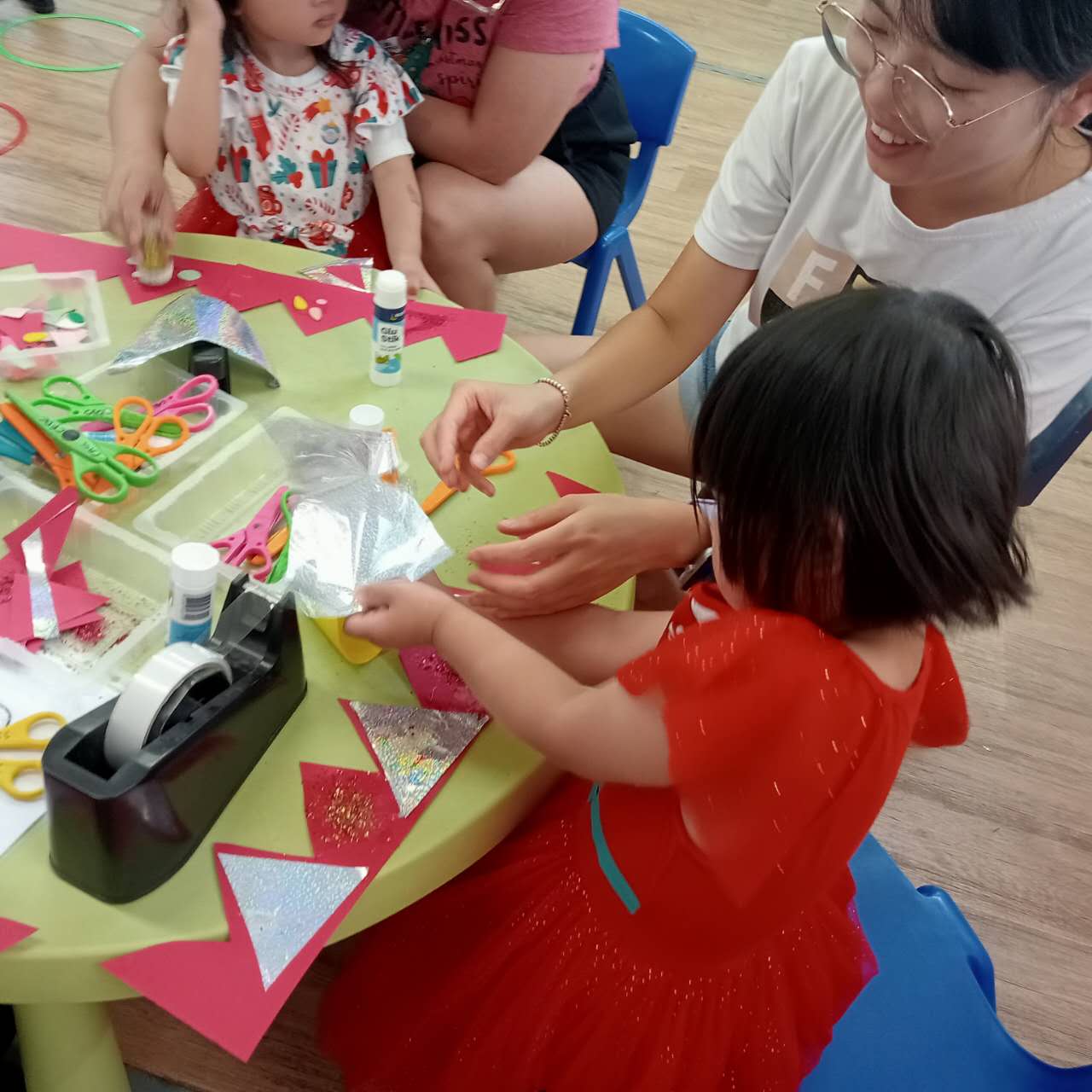 手工環節更是全場「最萌忙碌時刻」,彩紙、貼紙、小剪刀在小手裡叮叮當當地忙開了,家長們也半蹲、半抱、一邊指導一邊偷笑地加入創作。大家一起製作可愛的聖誕帽,看著孩子們戴上作品後興奮得眉毛都在跳,整個房間彷彿被瞬間點亮。