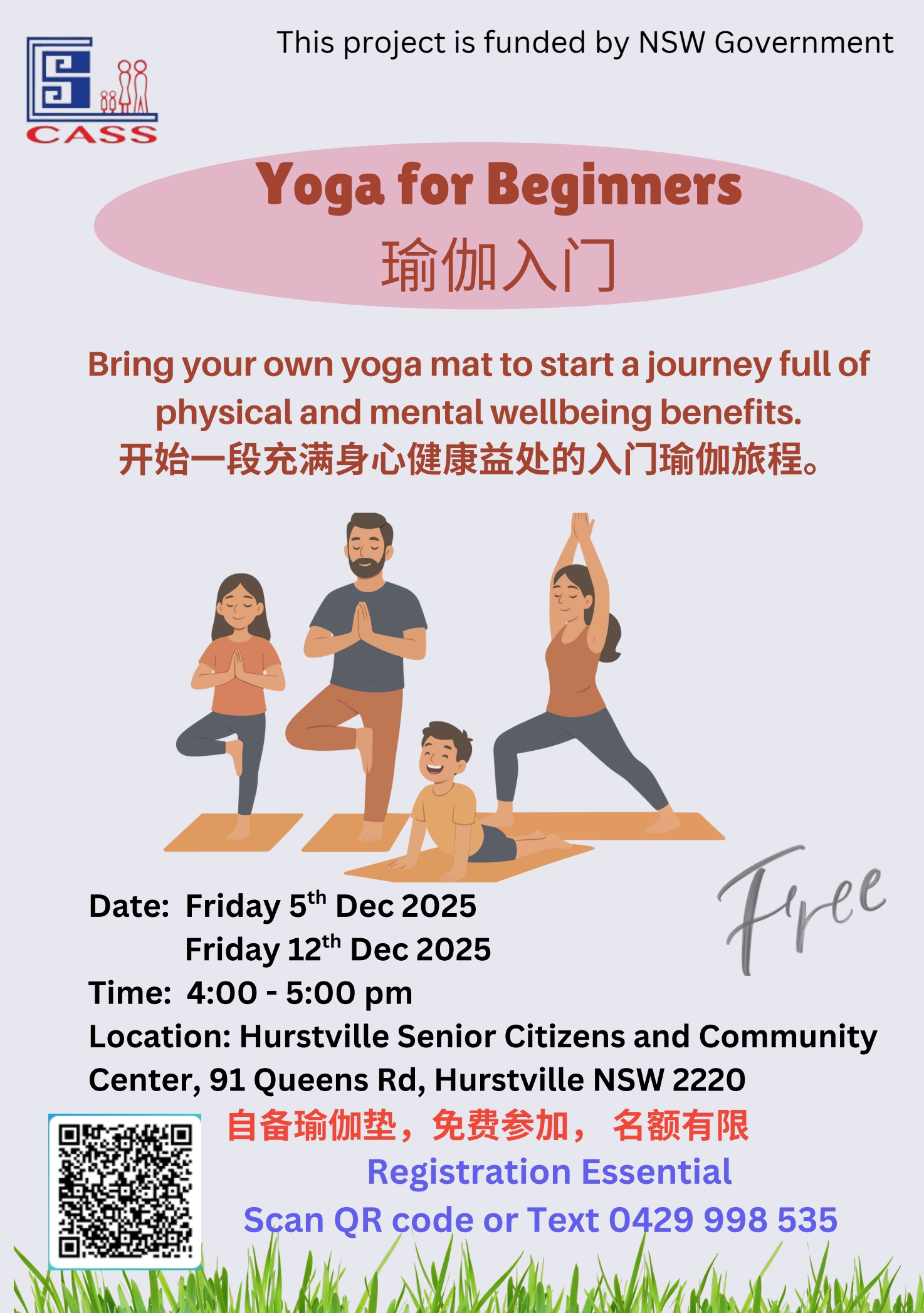 如果您想體驗瑜伽的益處,歡迎來參加我們華人服務社CASS備受好評的「瑜伽入門課程」,開啟身心的療癒之旅,享受瑜伽的美好能量!