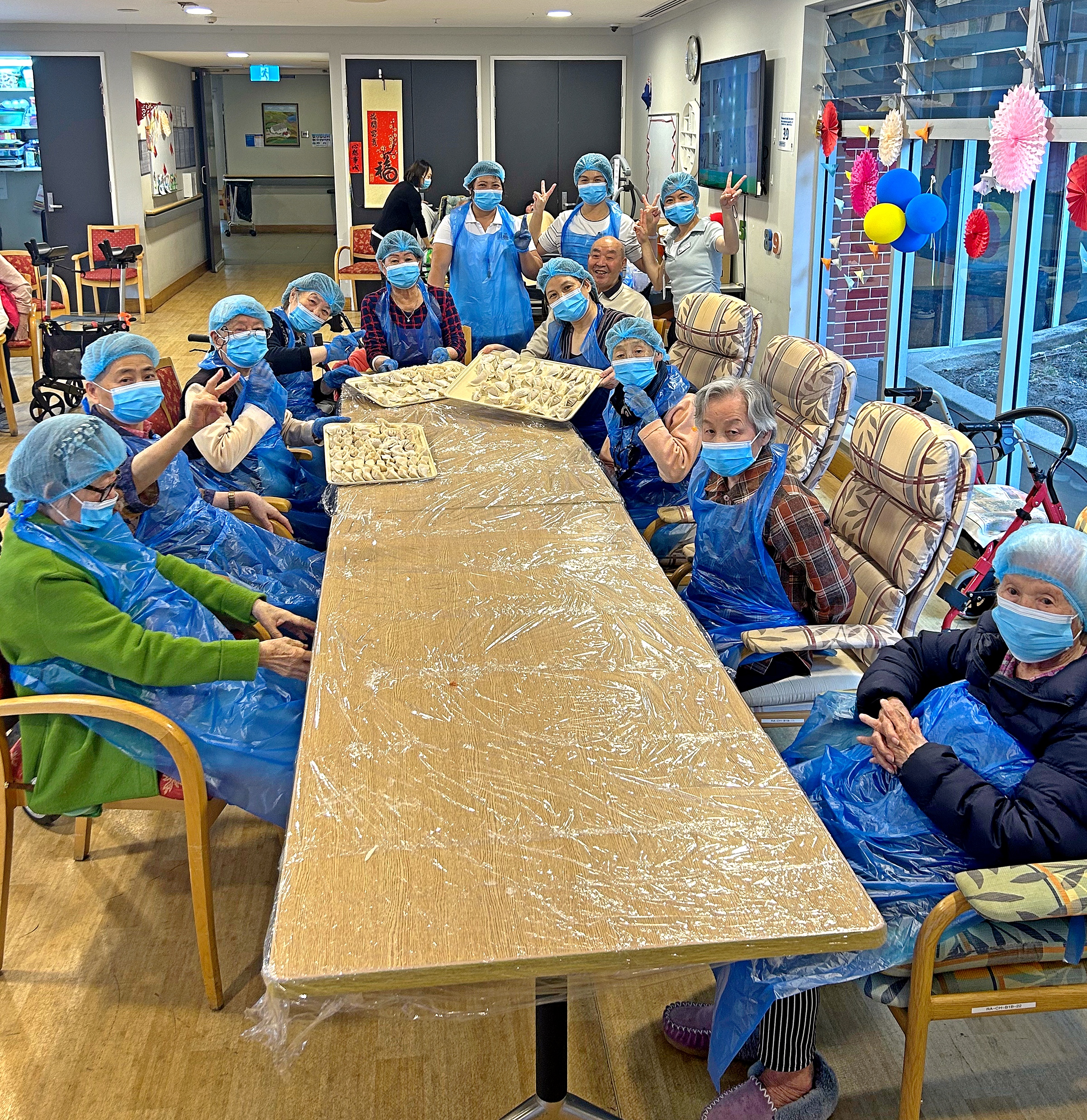 (圖:華人服務社高齡頤養院工作人員和長者們一同製作餃子。)
