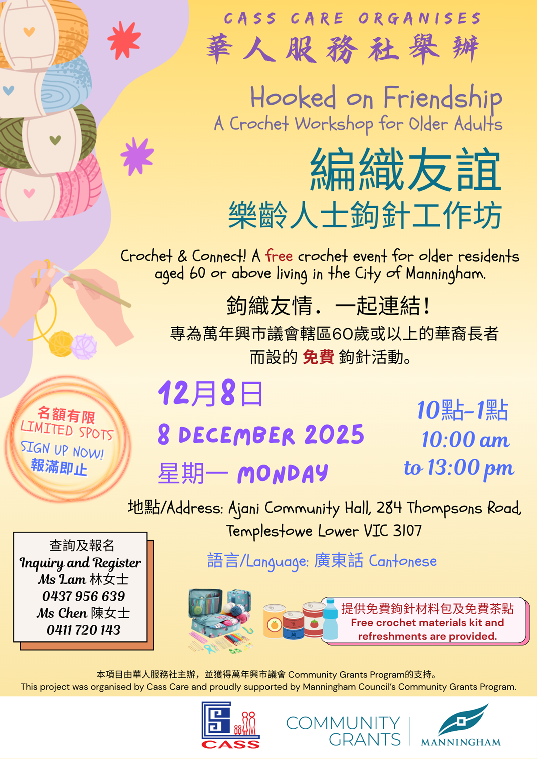 我們華人服務社誠邀您參加 「編織友誼:樂齡人士鉤針工作坊」。本活動由萬年興市議會 Community Grants Program 資助,全程免費!現場將提供免費茶點,每位參加者亦可獲得一份精美鉤針材料包。