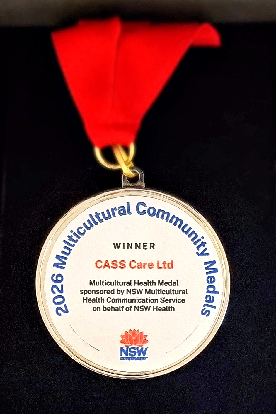3月26日(星期四)晚,在悉尼會展中心舉行的「州長和諧晚宴暨頒獎典禮」 (2026 Premier’s Harmony Dinner) 上,我社下轄的機構CASS Care獲頒發《多元文化健康獎》 (Multicultural Health Medal) 。由新州多元文化廳長Steven Kamper親自頒發。