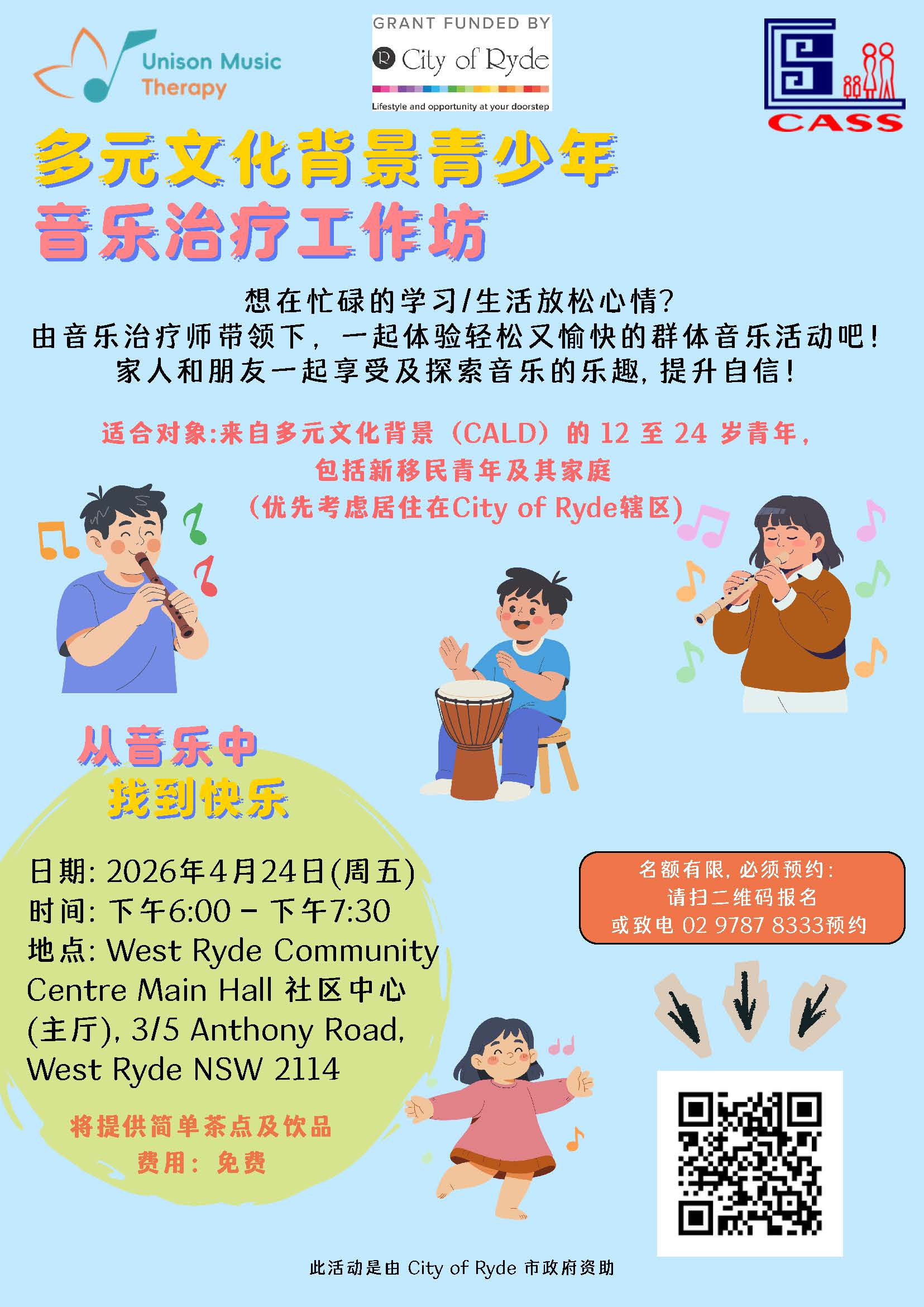 本活動獲 City of Ryde 市政府資助,旨在協助來自不同文化及語言背景(CALD)的青少年及其家庭,透過音樂提升心理健康與整體幸福感。