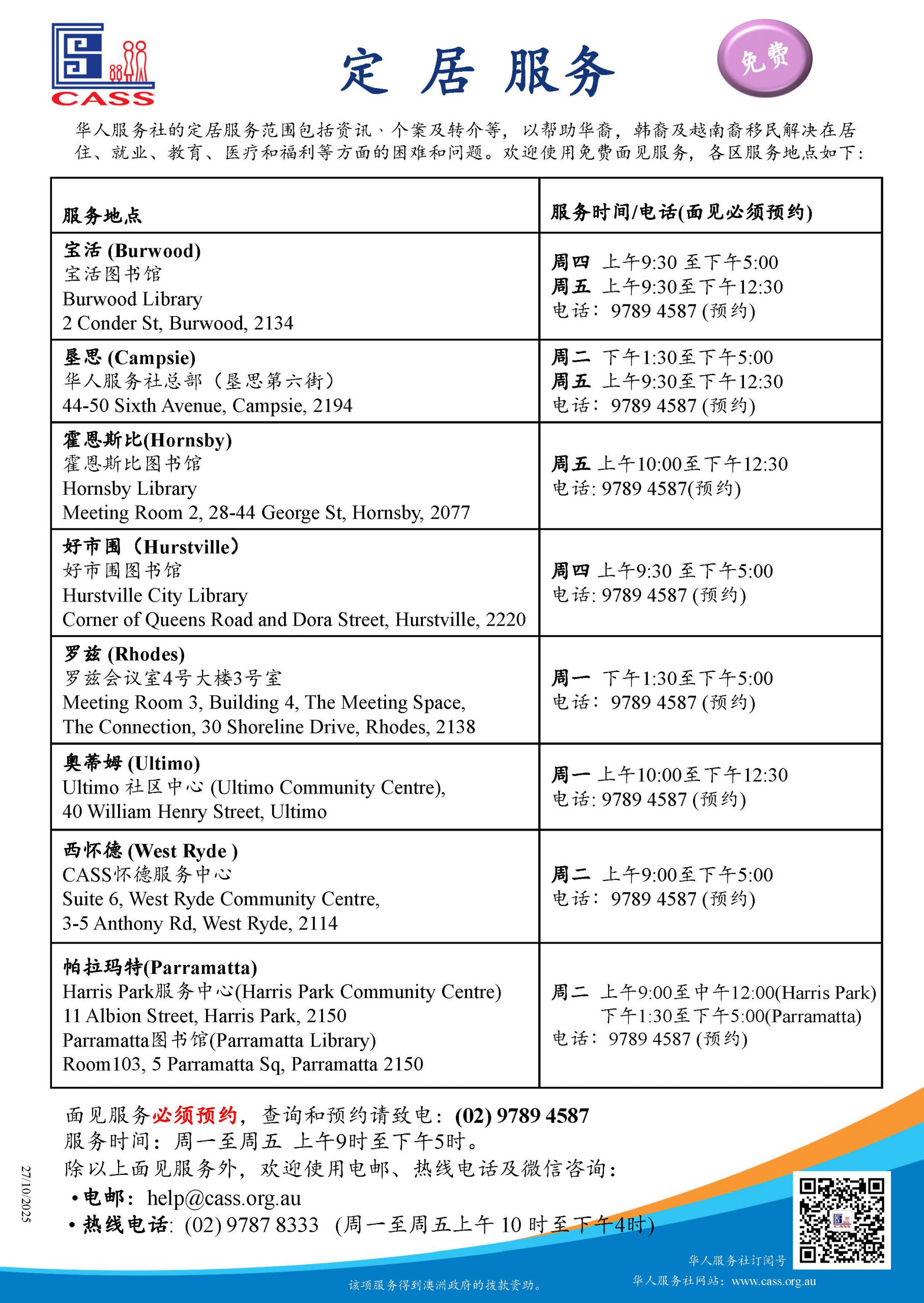我社定居服務協助新移民安居澳洲,如果您或者您的朋友新到悉尼,歡迎聯繫我們,諮詢居住、就業、教育、醫療、福利等問題。